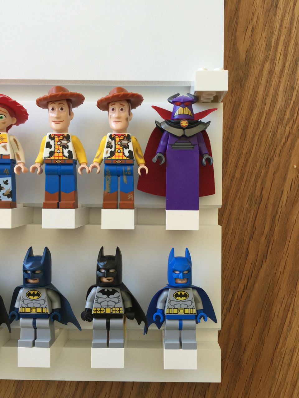 The next step was to fill the rack with Minifigures. I decided to put my Batman, Toy Story and Alien Conquest collection on it. This might have been a devious choice, since Zurg and Woody are exceptionally tall figures and the distance between the grooves is not big enough for them. But the figure above does not necessarily need to be just on top. You can slide it easily a bit to the right and the left to make.
